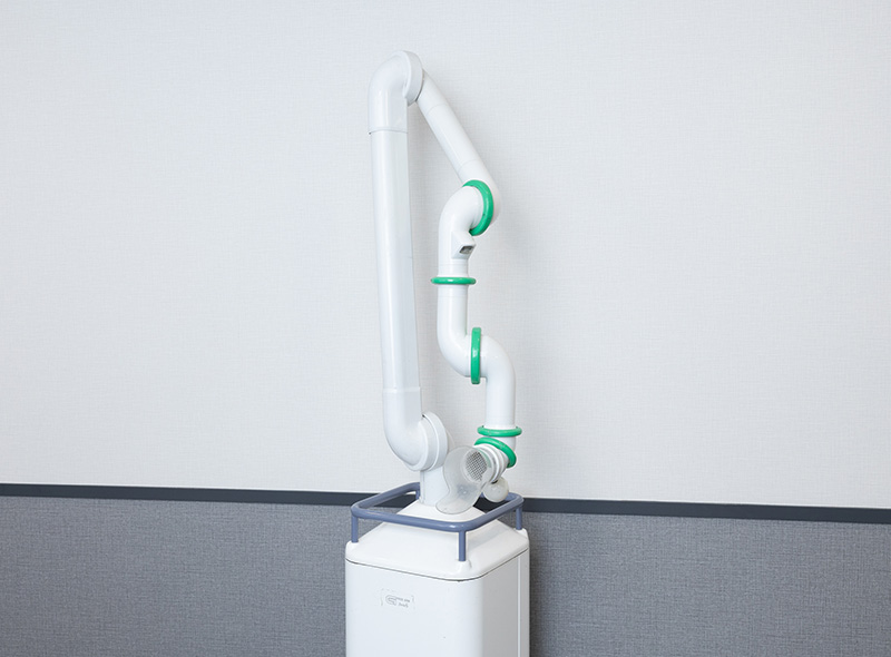 治療中に飛散する唾液や血液、歯や補綴物の削りカス、細かな粉じんなどを口腔外でしっかり吸引する装置です。診療中に発生する目に見えない微細な飛沫を素早く除去することで、空気中の汚染を防ぎ、院内の清潔な環境を保つ役割を果たします。