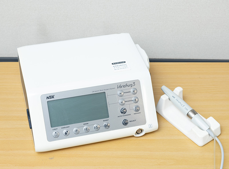 超音波の振動を利用して、必要な部分の骨だけを繊細かつ安全に削ることができる外科用機器です。主にインプラント手術や親知らずの抜歯などに使用され、神経や血管などの大切な組織を傷つけにくいのが特長です。