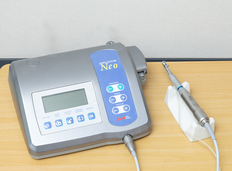 インプラント治療で、人工歯根を顎の骨に正確かつ安定して埋め込むための専用機器です。適切な回転数や圧力をコントロールできるため、骨への負担を抑えながら、精度の高い埋入が可能になります。