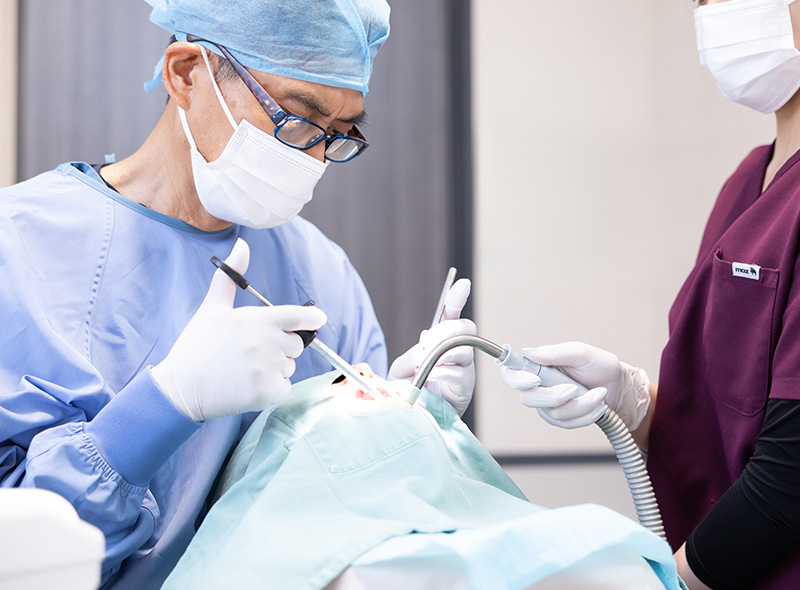 CTデータに基づき立案した計画に沿って、インプラント治療の基盤となる人工歯根(フィクスチャー)を顎の骨に埋め込みます。局所麻酔下で処置を進めるため、痛みはほとんどありません。 当クリニックでは「サージカルガイド」を使用し、精密な位置への埋入を追求しています。